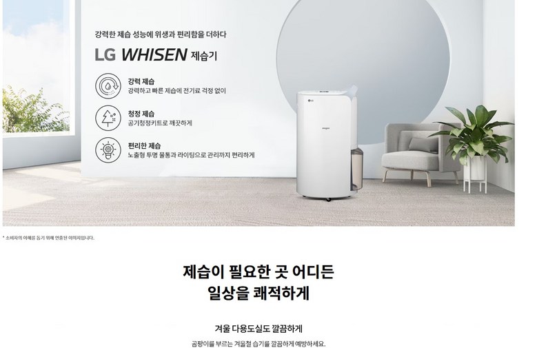 제품 설명: LG 휘센 제습기는 강력한 제습 성능은 물론, 30dB대의 저소음으로 밤에도 편안하게 사용할 수 있습니다. 스마트폰 앱(LG ThinQ)을 통한 원격 제어, 습도 조절, 에너지 모니터링 등 편리한 스마트 기능이 특징입니다. 오브제컬렉션 라인업은 인테리어와 조화를 이루는 디자인으로 소비자들의 만족도가 높습니다. 2025년에는 AI 기능이 더욱 강화될 것으로 기대됩니다.